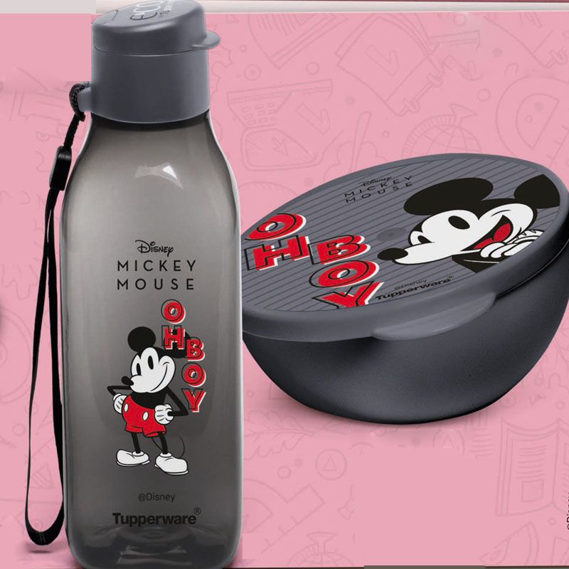 Conjunto Pote Redondo Mickey Retrô + Eco Tupper Quadrada Minnie é a garrafa de água da Tupperware foi especialmente desenvolvida pensando na sustentabilidade, feita em polipropileno que é um material rígido que deixa ela mais resistente. Além da decoracão do Mickey nessa Garrafa em parceria com a disney.