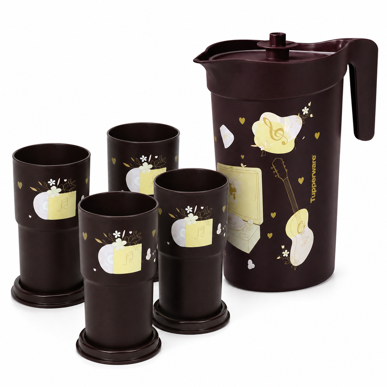 O Kit Tupperware A Jarra Ilúmina + Copos Simone Mendes No Ritmo do Coração 5 peças é perfeito para deixar a mesa mais bonita e a rotina mais prática. Com 1 jarra de 2 litros e 4 copos de 350ml, todos na cor Bordo e com decoração especial, é um conjunto pensado para servir bebidas com carinho, organizar melhor na geladeira e trazer mais charme para os momentos em família.