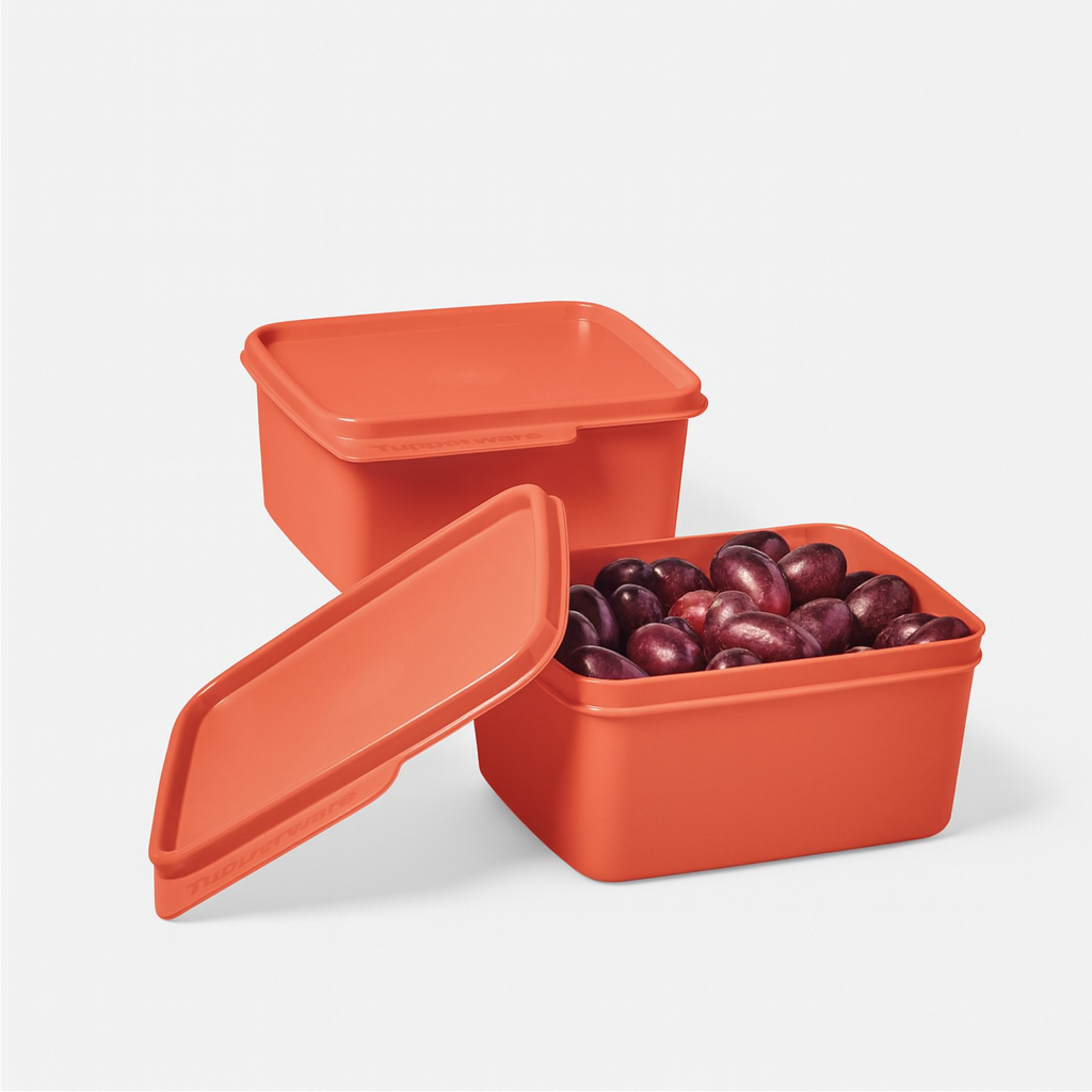 A cor Laranja Coral ilumina a organização, criando aquele visual leve e moderno que transforma até o pré-preparo da semana em algo mais prazeroso. Já o formato quadrado foi pensado para aproveitar melhor cada espacinho da geladeira, encaixando, empilhando e deixando tudo mais prático.