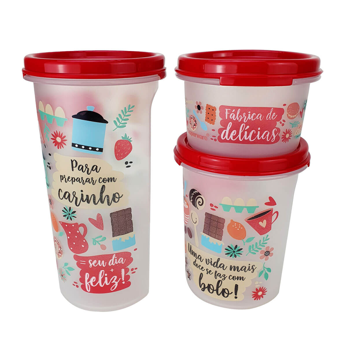 O Kit Tupperware Modulares Redondos Confeitaria 3 peças é a combinação ideal para armazenar diversos tipos de alimentos e deixar a sua cozinha mais bonita e organizada. Possuem tampa hermética, com design redondo, permitindo empilhar sem ocupar muito espaço. Disponível em três tamanhos: 200ml, 440ml e 650ml na decoração Confeitaria. Adquira já o seu Kit!