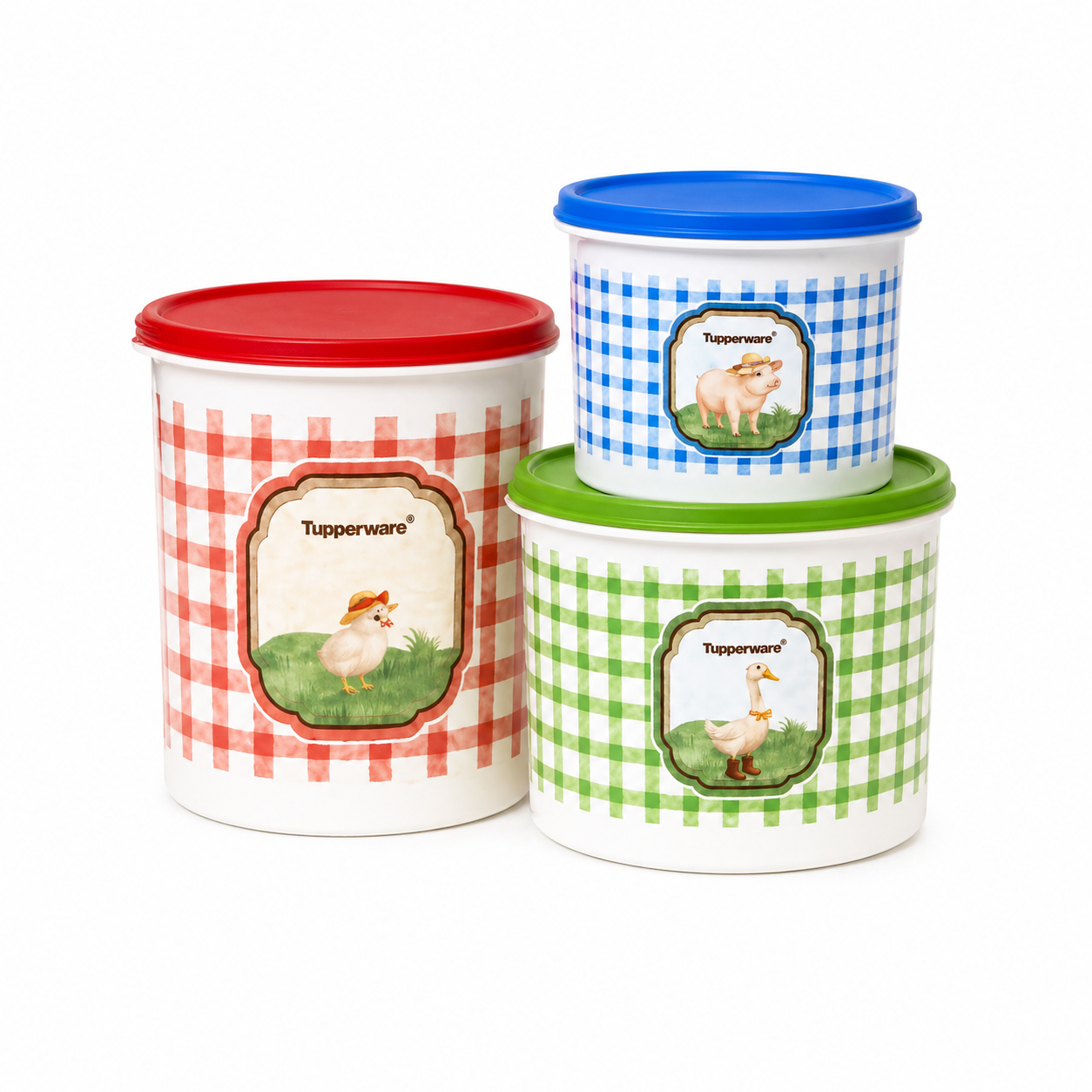 O kit acompanha 3 Tupper Caixas da linha Da Roça: Porquinho 1,1 litro, Patinho 2,4 litros e Galinha 3,7 litros.