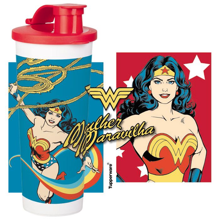| Cor | Branco, tampa vermelha e design da Mulher Maravilha |