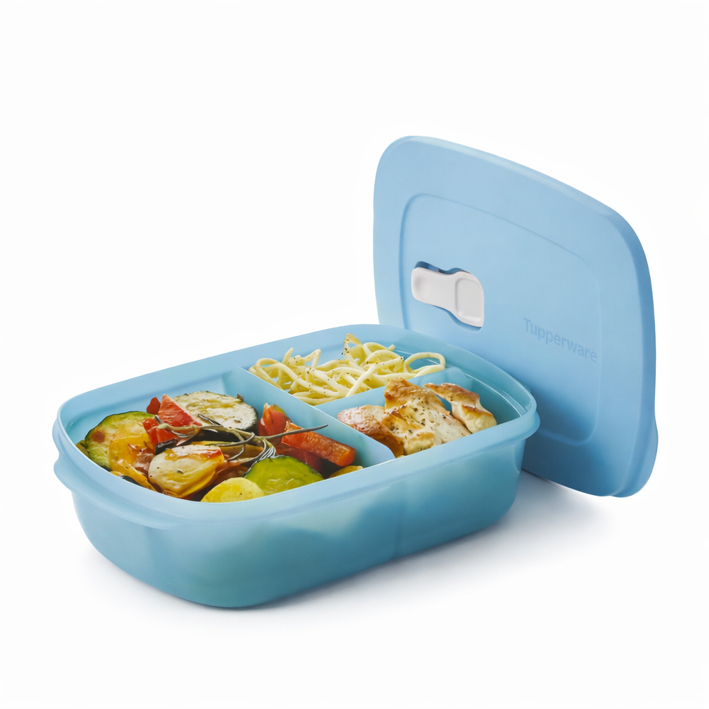A Tupperware Cristalwave Retangular com Divisórias Geração II 1 litro Azul Céu é perfeita para quem quer praticidade de verdade na rotina. Sabe quando você quer levar comida pronta, separar acompanhamentos e ainda aquecer sem sujar mais louça? As divisórias ajudam a manter cada alimento no seu lugar (sem misturar tudo), e o formato retangular é ótimo para organizar na geladeira e na bolsa. E o melhor: você pode aquecer no micro-ondas com tranquilidade, deixando o dia muito mais fácil.