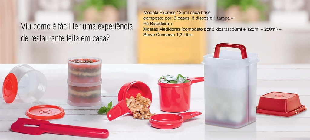 | Composto por: | -Modela Express 125 ml cada base ( 3 bases, 3 discos e 1 tampa) -Pá Batedeira -Xícaras Medidoras (3 xícaras: 50ml, 125ml e 250ml) -Serve Conserva 1,2 litro |